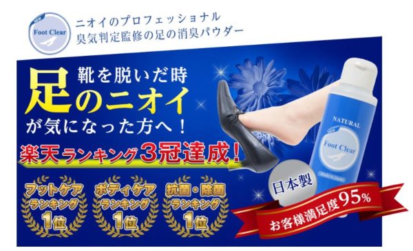 フットクリアはパウダータイプの靴の消臭剤となります。フットクリアが人気の理由は1度の利用で約半年持続する効果にあります。ボトルタイプなためサッと振りかけるだけの手軽さもいいですね。